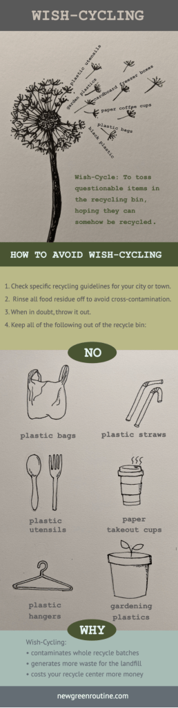 Perhaps you’re like I was and tossing all of your plastic — #s 1 to 7 — all together into your recycling bin. There’s a term for that: wish-cycling. Wish-cyclers toss questionable items in the recycling bin hoping they can somehow be recycled. Please peruse the graphic below from new green routine to understand wish-cycling, how to avoid it, and why.